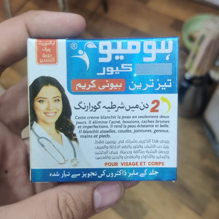 DescriptionHomeo Cure Whitening Beauty Cream 20gm – Fast Brightening Formula For Face And Body, Removes Dark Spots, Pimples, And Uneven Skin ToneHomeo Cure Whitening Beauty Cream 20gm Is A Powerful Skin Brightening Formula Designed For Both Face And Body. Enriched With Active Ingredients, It Works Effectively To Reduce Dark Spots, Pimples, Acne Scars, And Pigmentation. The Cream Provides Intense Moisturization While Promoting A Smooth, Radiant Complexion. It Helps Lighten Dark Areas Such As Elbows, Knees, Joints, And Underarms, Giving Your Skin An Even Tone And Healthy Glow. Suitable For Daily Use, This Cream Is Dermatologically Recommended For All Skin Types Seeking Quick And Visible Whitening Results.Key Features:Fast Whitening Results Within 2 DaysRemoves Acne, Pimples, And Dark SpotsBrightens Skin Tone And Restores Natural GlowLightens Dark Areas Like Elbows, Knees, And UnderarmsProvides Deep Moisturization And Soft TextureSuitable For Face And Body UseRecommended By Skin ExpertsCompact 20gm Pack For Easy Daily Use